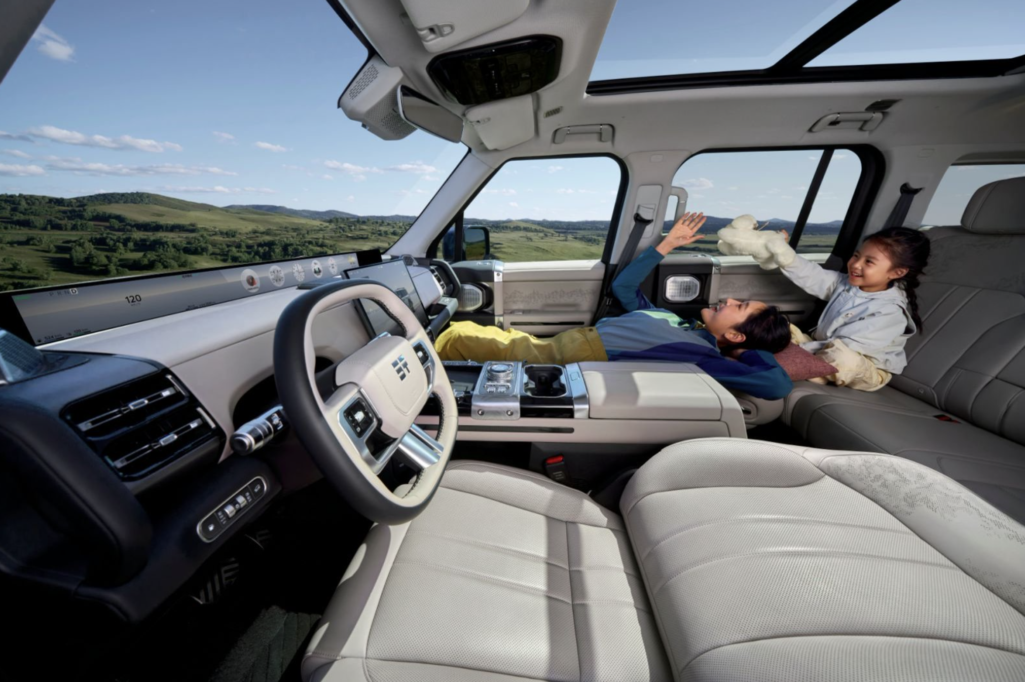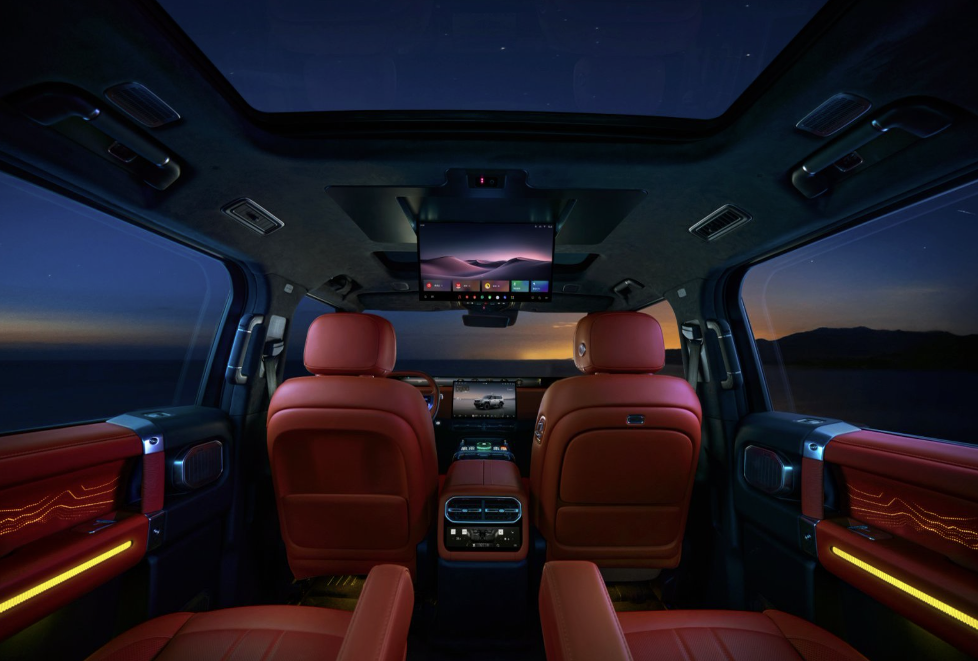进入车内,与外观形成明显反差的是内饰的豪华感,大量软性皮质包覆与金属质感饰件的搭配运用,带来独树一帜的质感,硬核且细腻。15.6英寸悬浮式中控屏、超77英寸巨幕级屏幕带来极致科技的交互体验,另外硬派越野所不具备的舒适性,新车也给你全部配齐。