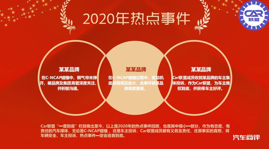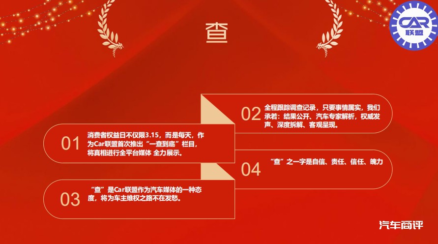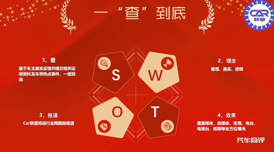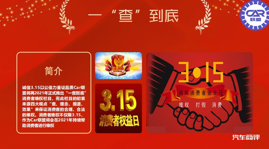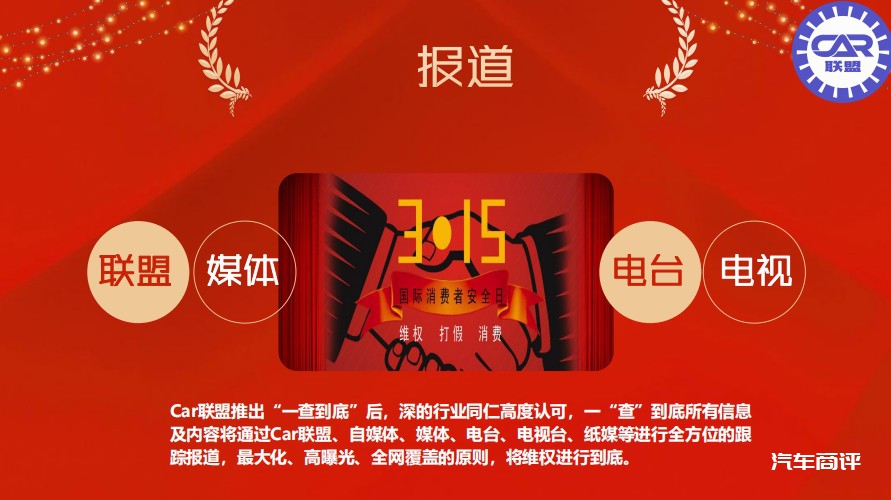 Car联盟将在2021年正式推出“一查到底” 消费者维权栏目,而此栏目的初衷来源四大观点“查、理念、报道、 效果”来保证消费者的合理、合法的维权。消费者维权不仅限3.15, 作为Car联盟将会在2021年持续帮助消费者进行维权,作为C-NCAP的核心媒体,将会对碰撞结果第一时间进行跟踪报道。