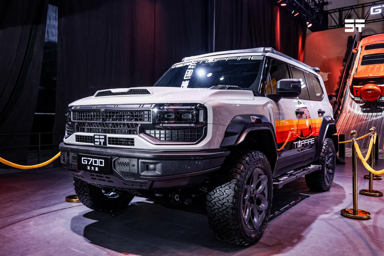 展台上,纵横与国内顶级汽车改装品牌中国顶火车会联手共创的G700顶火版也吸引了观众的热情围观。G700顶火版采用战斗美学设计,在保留城市舒适性的基础上,通过系统性改造赋予其专业探险⼯具属性,实现公路巡航与荒野征服的无缝切换。