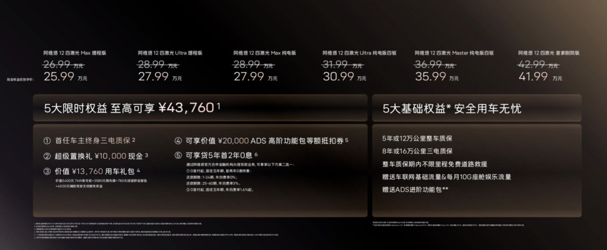 10月28日,汽车商评从阿维塔科技官方处了解到,旗下新车阿维塔12四激光版正式上市,共6个车型版本,覆盖纯电和增程双动力,官方指导价26.99万元-42.99万元,权益后到手价为25.99万元-41.99万元。