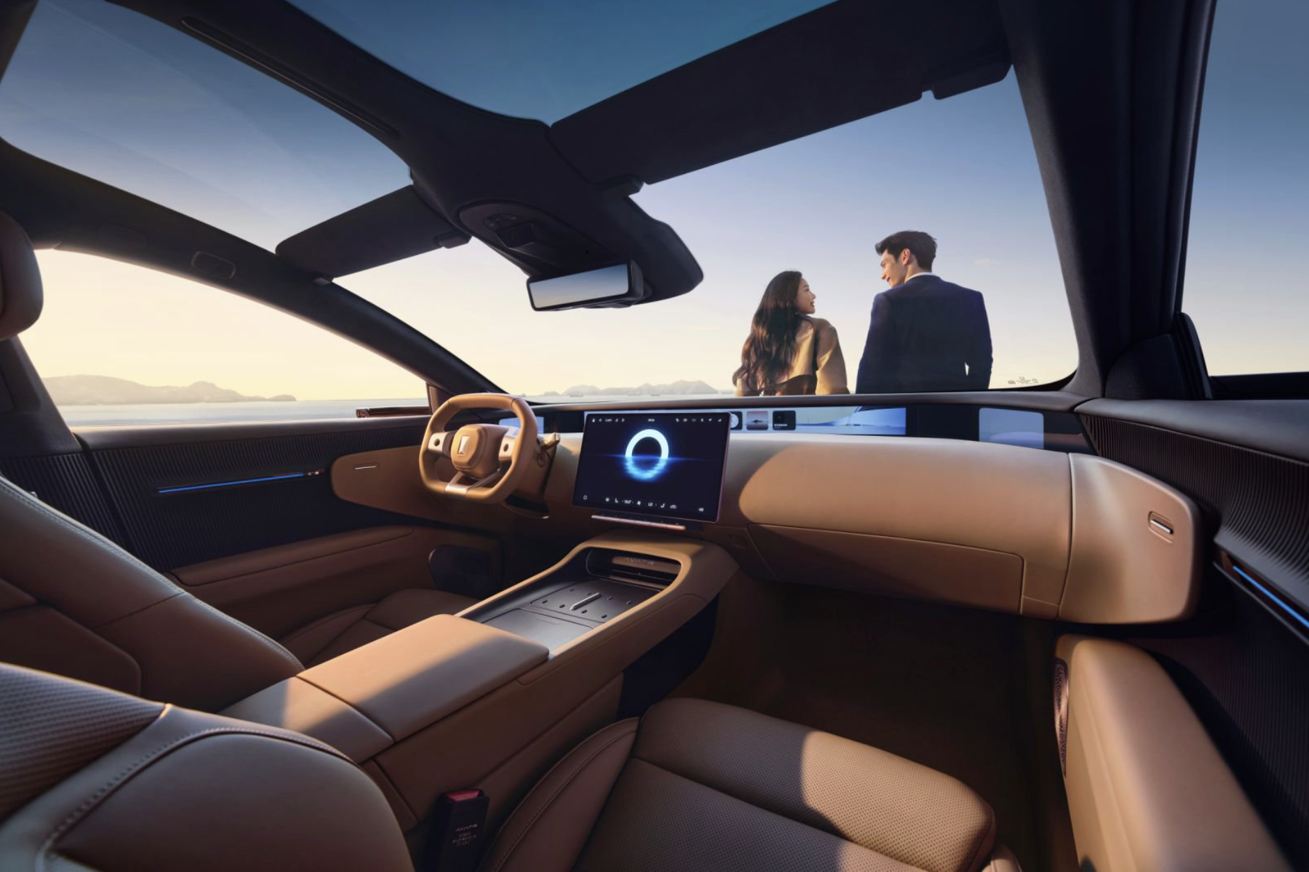 移步车内,新车采用Gentle Tech极简设计,座舱为环抱式造型,搭载35.4英寸4K全景宽屏+15.6英寸中控屏,车机内置鸿蒙座舱HarmonySpace 5系统,交互体验毋庸置疑。
