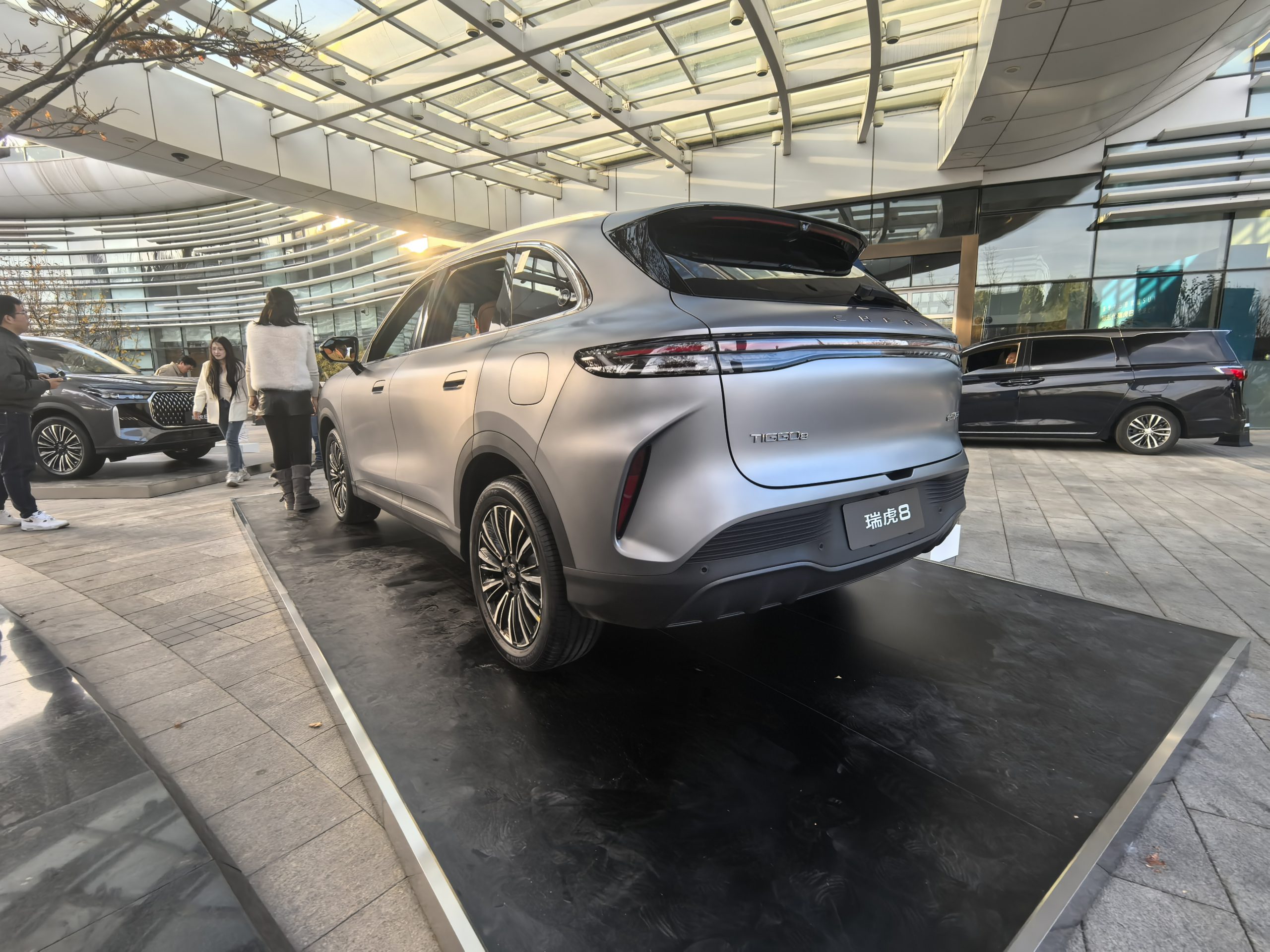 车尾部分,第五代瑞虎8整个尾部造型十分饱满,贯穿式的尾灯组有点保时捷的味道,上方的小尾翼和下方的扩散器设计,也营造出恰到好处的运动范儿。虎款则是采用了双边双出排气,同样很有辨识度。
