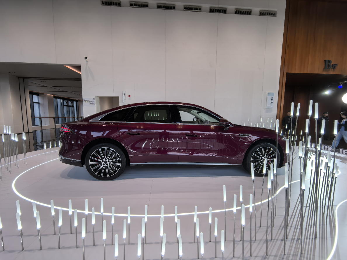 侧面采用了溜背式设计,由于车身体量较大,因此整个线条都十分舒展,具有一定的优雅感。新车配备双冗余半隐藏式门把手,低风阻还安全。尺寸上,新车长宽高分别为5018/1965/1500mm,轴距为3000mm。