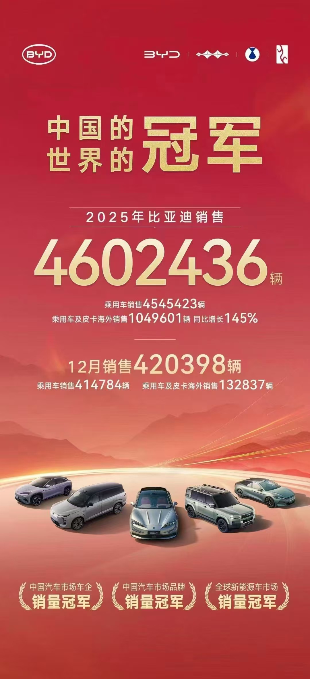 比亚迪,以所有人都想不到的方式,成为了NO.1,更准确的说,是全球第一。官方最新数据显示,比亚迪在2025全年新能源汽车总销量达到460.2万辆,再次坐稳全球最大新能源汽车车企的地位。