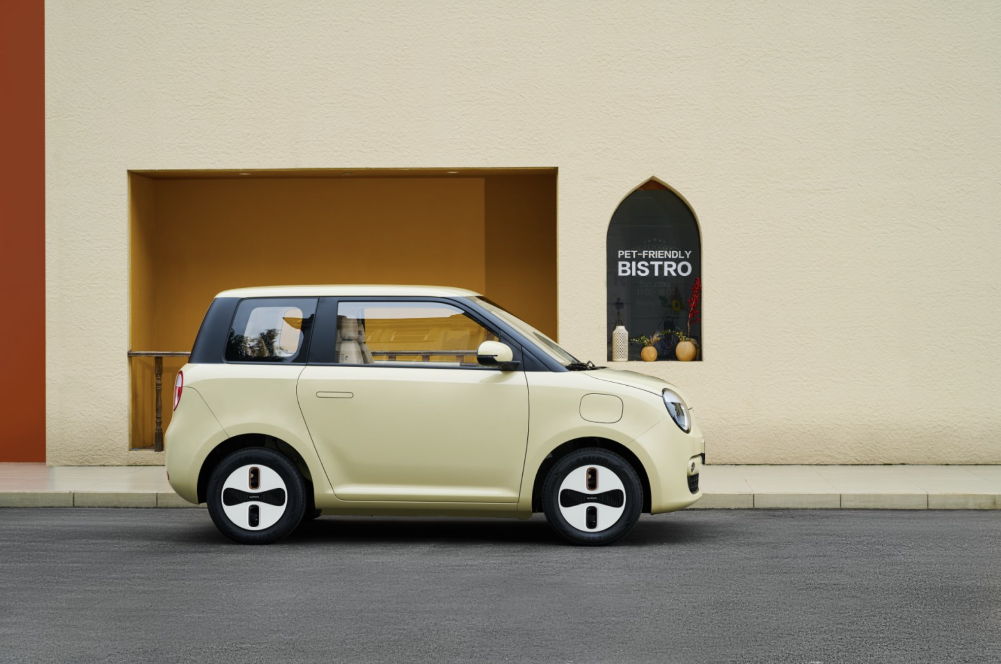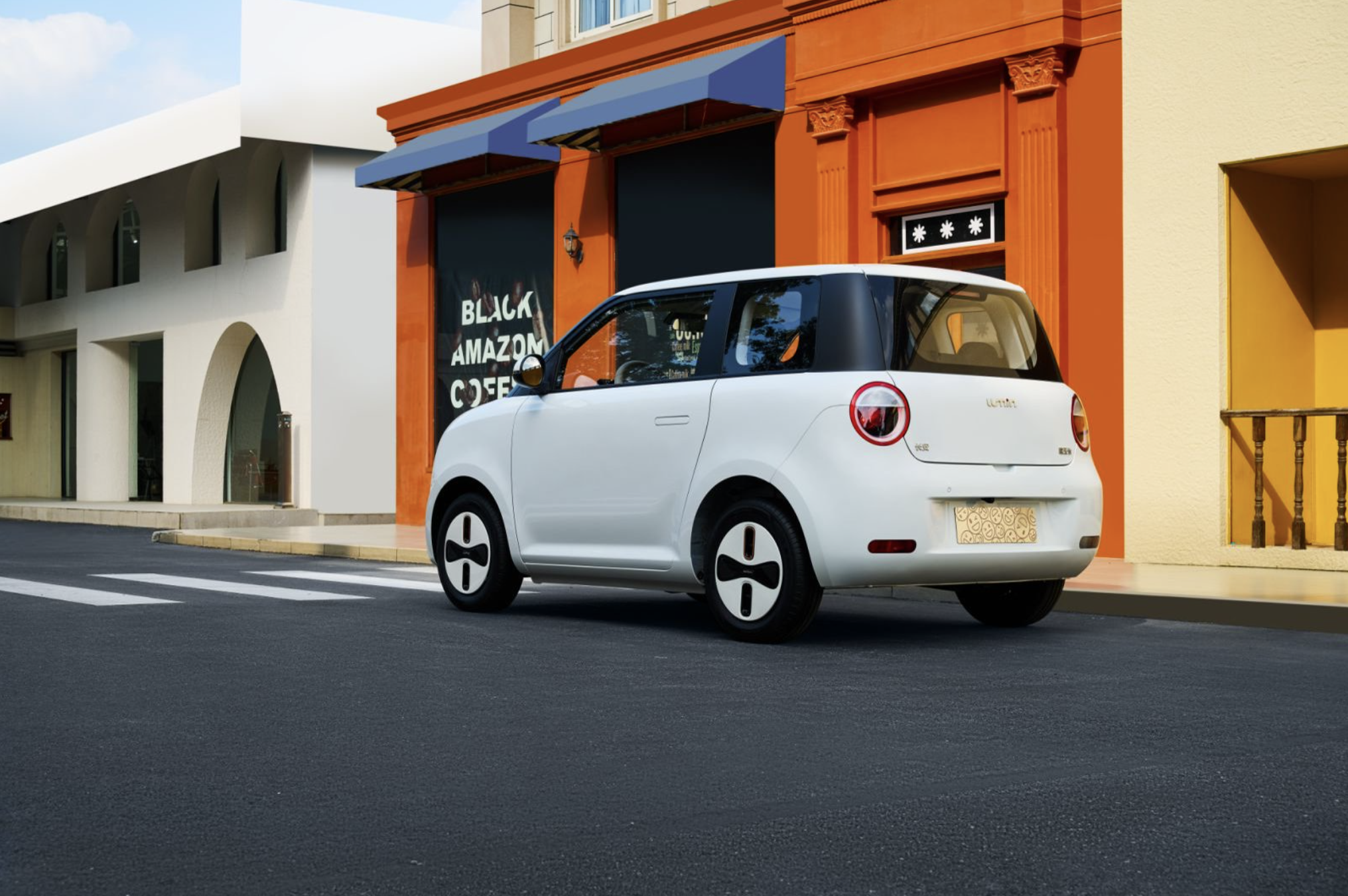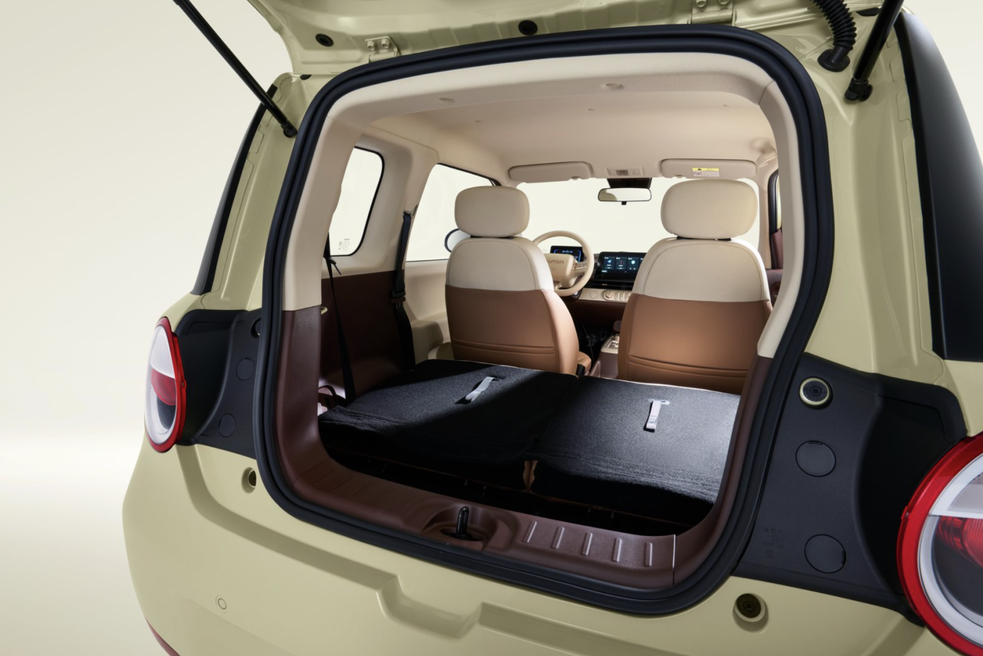 车尾造型圆润饱满,两侧为圆型大灯组,中间为红色点缀,萌萌哒很可爱,也与车头实现了风格上的呼应。