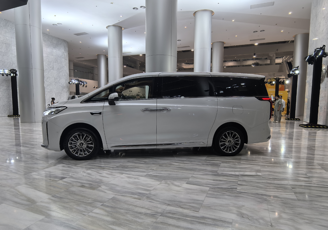 侧面同样延续了高山8的轮廓线条,隐藏式B/C/D柱将车身营造出一种悬浮效果,逐渐下沉的腰线则让整体显得沉稳不浮夸,搭配双侧滑门和双色轮圈,低调中带有一丝高级感。尺寸上,高山7长宽高分别为5050/1960/1900mm,轴距3085mm,相比高山8和高山9来说,城市驾驶会更灵活几分。