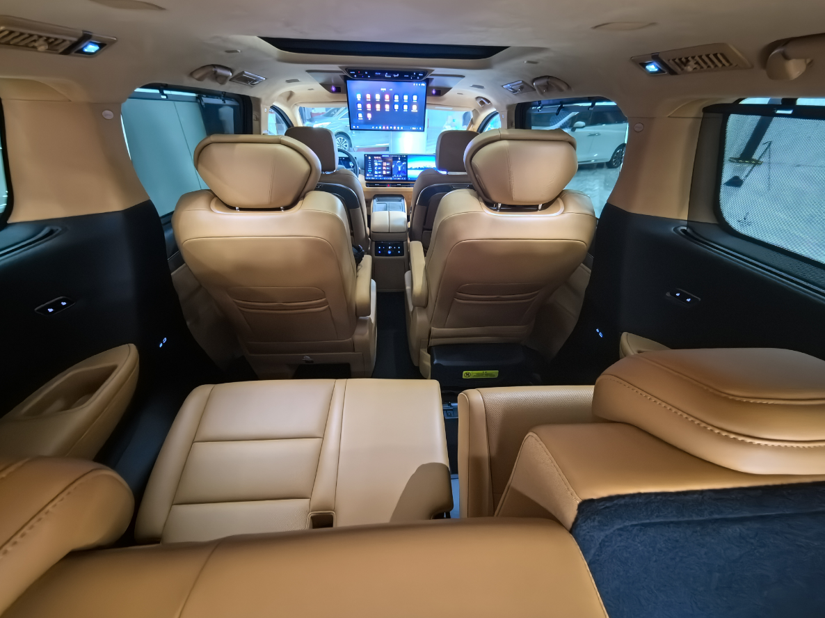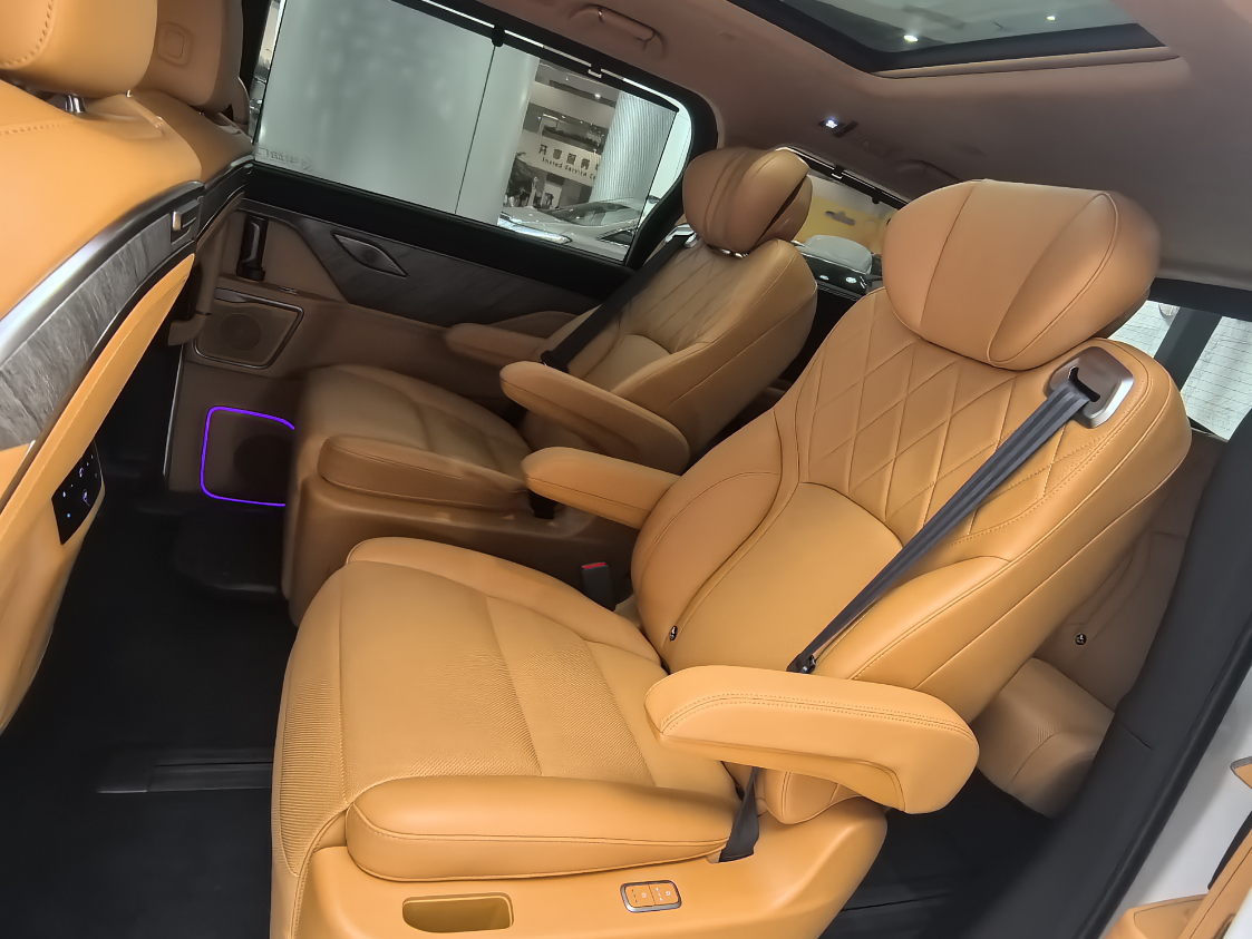 进入车内,MPV重点是第二排,两张独立航空座椅采用Nappa真皮材质,提供加热、通风、按摩、腿托等功能,并且还有收纳小桌板、17.3英寸后排娱乐屏、12.5L智能冷暖冰箱,满足主流用户的多元化需求。