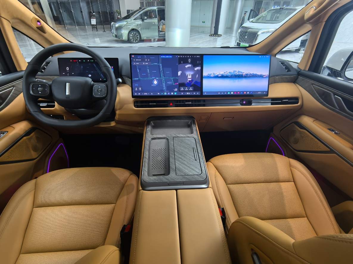 前排配备12.3英寸仪表屏、26英寸HUD、双15.6英寸中控屏与副驾屏,车机内置车规级8295芯片+ Coffee OS 3.2系统,同时在Coffee GPT大模型加持下,能够实现不错的智能交互体验。