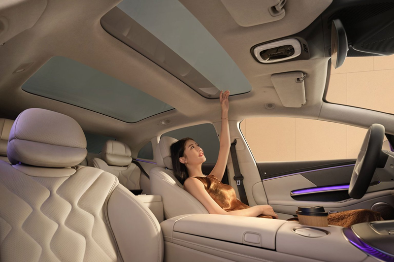 除此之外,昊铂A800针对很多细节进行创新。比如它的遮阳帘采用了悬浮式设计,其遮阳帘隐藏在两块天幕玻璃之间,既能通过双层玻璃提升静谧性,又保证了通透感与遮阳效果的兼顾,除了成本高之外,这一设计几乎没有缺点。