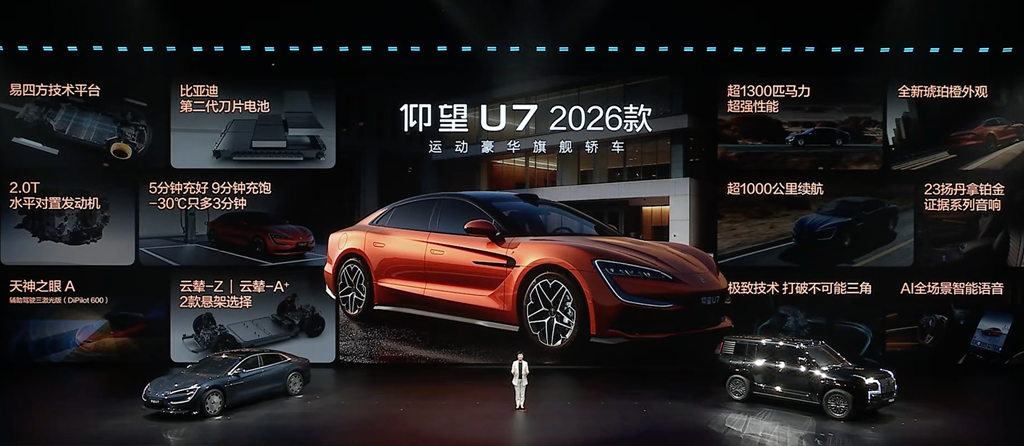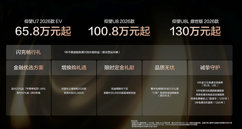 在3月5日举行的比亚迪颠覆性技术发布会上,比亚迪旗下豪华品牌仰望完成了U7、U8、U8L三大旗舰车型的2026款新车上市。其中,仰望U7 起售价65.8万元、仰望U8 2026款起售价100.8万元、仰望U8L 2026款起售价130万元。