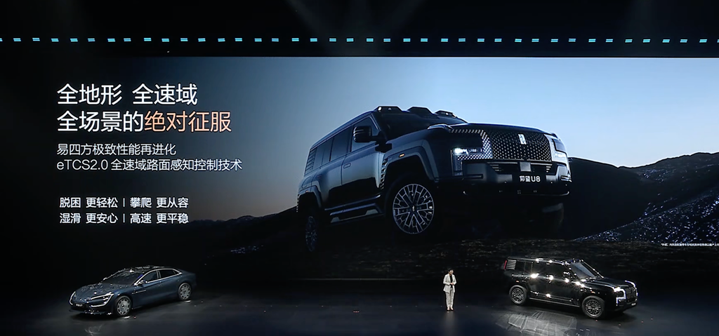 针对越野和长途穿越场景,仰望U8 2026款还实现了续航里程的升级,其综合续航里程提升20.5%,达到了1205Km,更进一步契合了长途自驾游、无人区穿越的场景需求。另外,这款新车还在底盘性能与智能化表现上有所进阶。其搭载的易四方系统,升级了eTCS2.0技术,扭矩控制更精准及时,能让车辆进一步增强在全速域、全地形场景下的动态控制能力,提升车辆的行驶姿态稳定性。