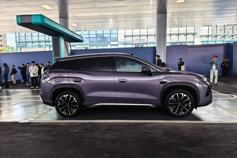 来到车身侧面,宋Ultra EV定位于B级SUV,其尺寸要比宋L更大。它的长宽高分别达到了4850/1910/1670mm,轴距为2840mm,这样的尺寸也带来了不输汉兰达的饱满侧面姿态。不过相对来说,宋Ultra EV整体的线条元素更丰富,车身侧面的悬浮式车顶、半隐藏式门把手勾勒出了更有力的肌肉感,满足国内年轻用户的审美需求。