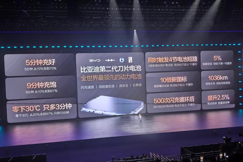 3月5日,在比亚迪颠覆性技术发布会上,比亚迪发布了第二代刀片电池、兆瓦闪充2.0等多项新能源技术。