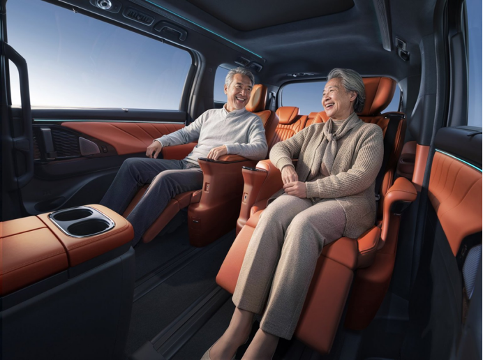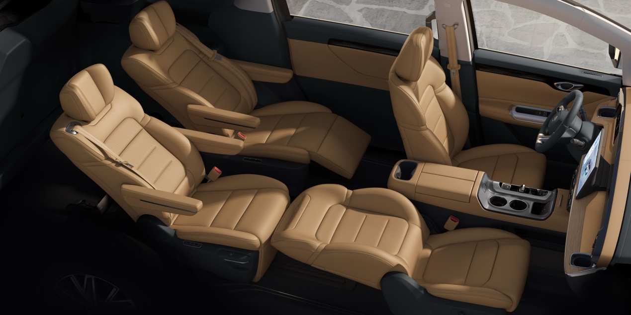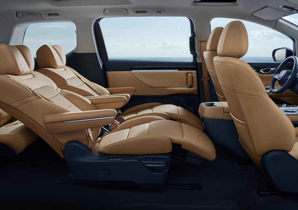 豪华舒适性上,新车第二排豪华航空座椅支持10向电动调节,配备通风、加热与10点式按摩功能,通过扶手屏更是可以一键即可切换至零重力舒躺模式。全车采用多层隔音玻璃,怠速噪音低至40.8dB,配合行业首创的无风感健康空调,为老人孩子营造出图书馆级的静谧健康空间。而且在第一排的主副驾上更是搭载通风加热按摩功能,而且可伸缩腿托更是让第一排获得更好的乘坐体验,真正实现全车座椅平权。